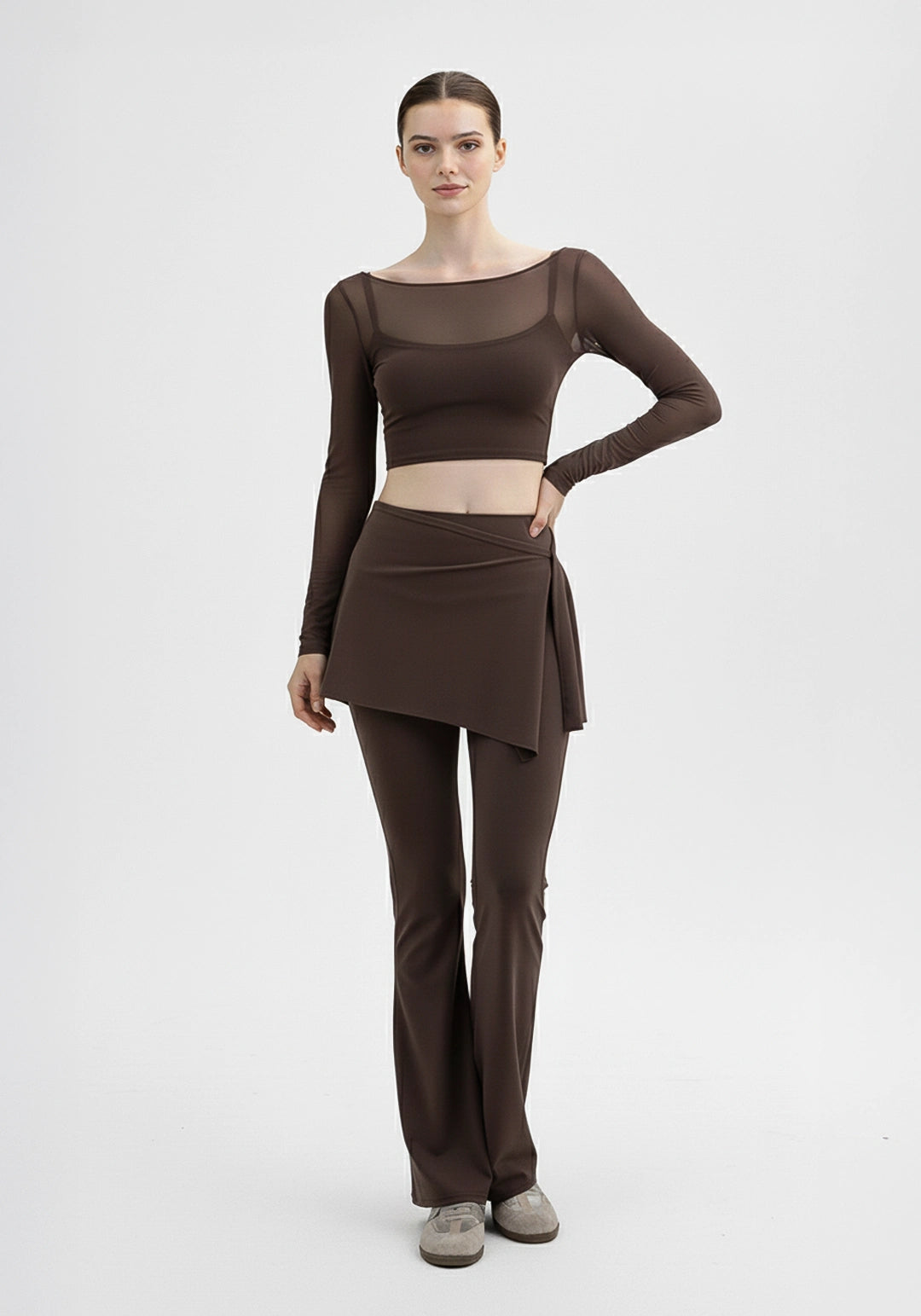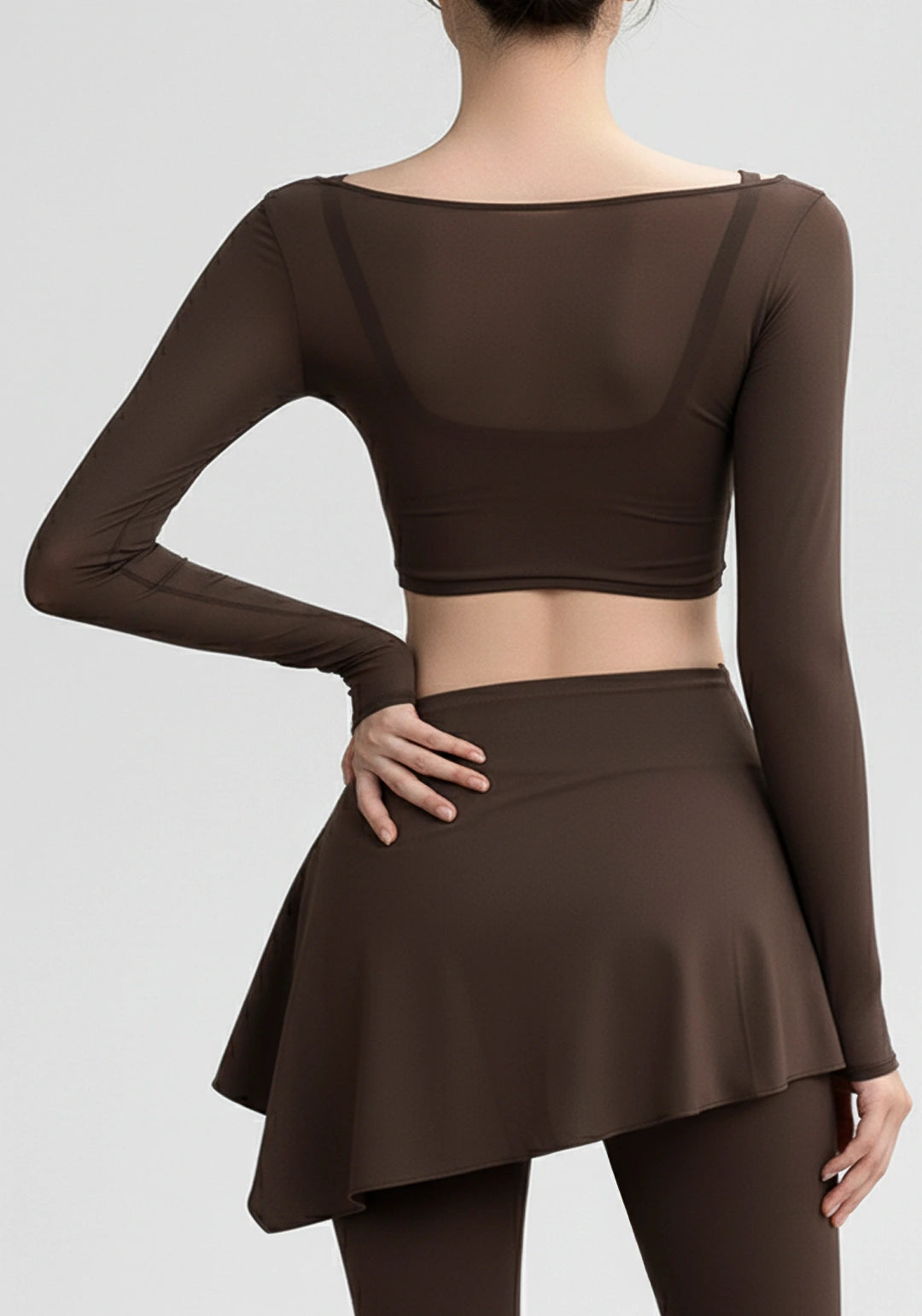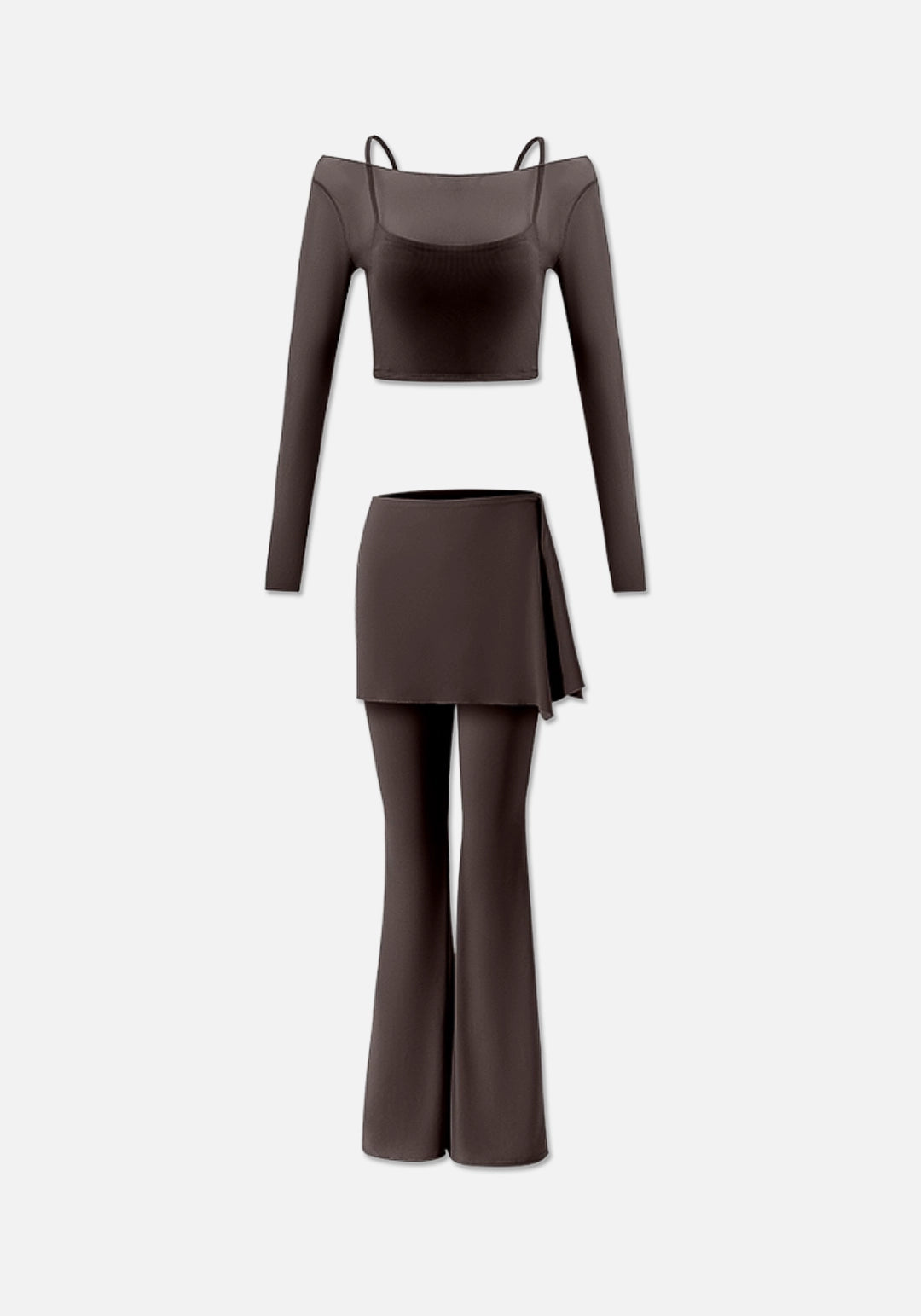 • Complete 3-Piece Set – Includes flared leggings, mesh crop top with built-in bra, and detachable wrap skirt.